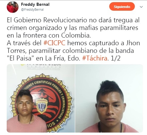 @freddybernal “El Gobierno Revolucionario no dará tregua al crimen organizado y las mafias paramilitares en la frontera con Colombia. A través del #CICPC hemos capturado a Jhon Torres, paramilitar colombiano de la banda «El Paisa» en La Fría, Edo. #Táchira.”
