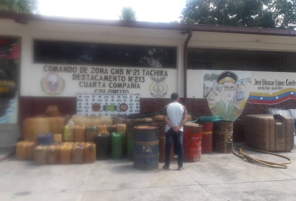 Donde había 5.000 litros de diésel, 1.200 litros de gasolina, variedades de envases plásticos y mangueras para el tráfico en la frontera. Además, se detuvo a un ciudadano que estaba en el lugar».