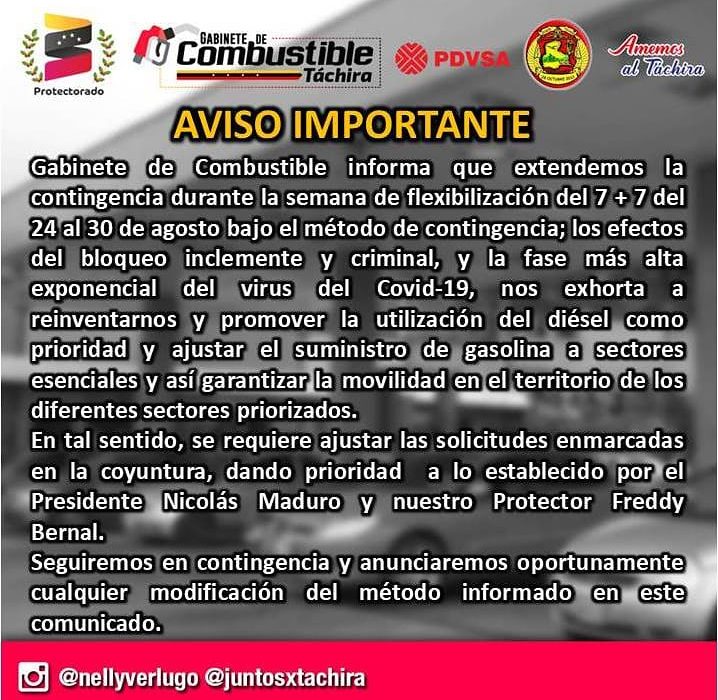 El Gabinete de Combustible del Protectorado del Táchira anunció que extiende la contingencia desde el lunes 24 al 30 de agosto; en la semana de flexibilización del 7+7 bajo el método de contingencia.