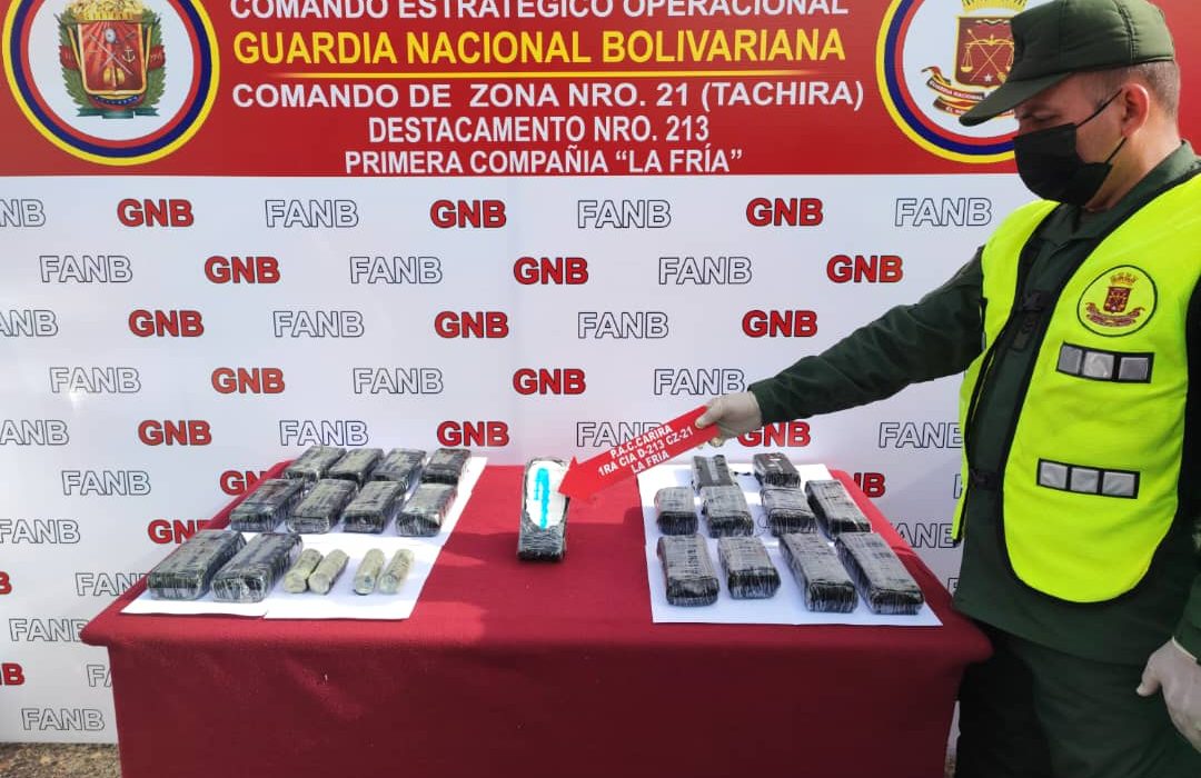 En un nuevo procedimiento llevado a cabo durante las últimas horas en la región tachirense, efectivos de la Guardia Nacional Bolivariana, adscritos al puesto de control fijo El Cariña, La Fría, municipio García de Hevia, detuvieron a dos ciudadanos con 25 envoltorios de sustancias ilícitas; con un peso aproximado de 11.175 kilógramos.