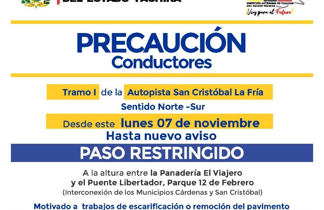 El titular del Instituto de Vialidad (IVT), Ángel Márquez, anunció que el 7 de noviembre habrá medida de restricción vehicular en el tramo I de la Autopista San Cristóbal La Fría, a la altura entre la Panadería El Viajero y el Puente Libertador, en el Parque 12 de Febrero, pista sentido Norte –Sur; motivado a que se iniciará el proceso de escarificación o remoción del pavimento desgastado.