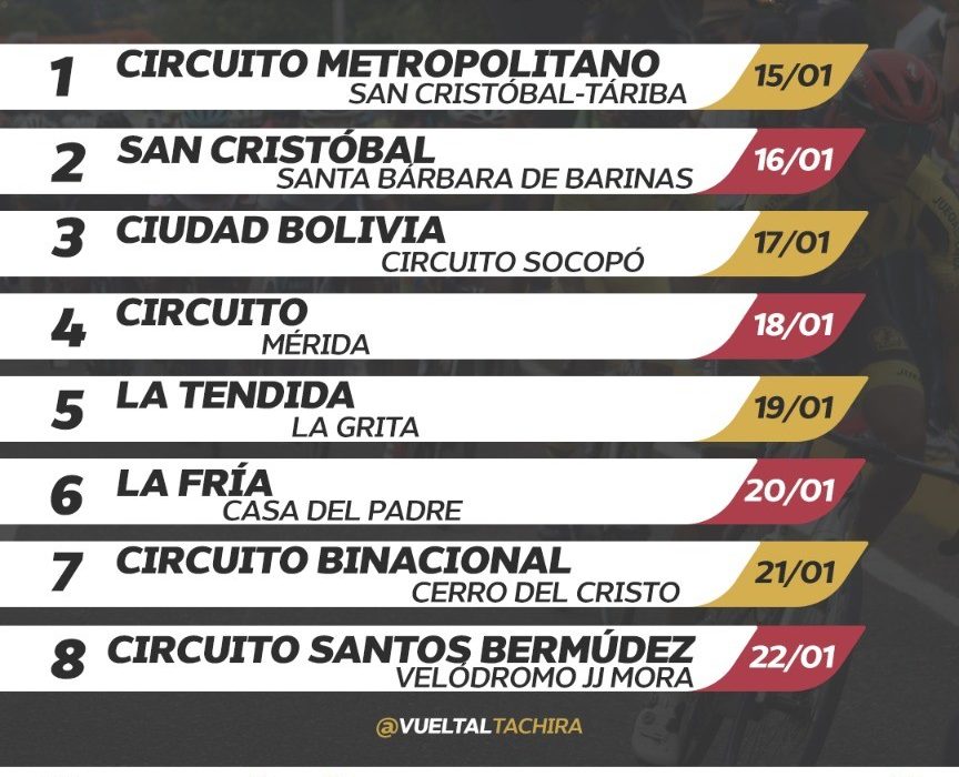 Mérida, Barinas y, por supuesto, Táchira, serán los estados en los que se disputará la 58º edición de la grande de América. Ocho etapas de alto impacto se vivirán entre el 15 y el 22 de enero del 2023.
