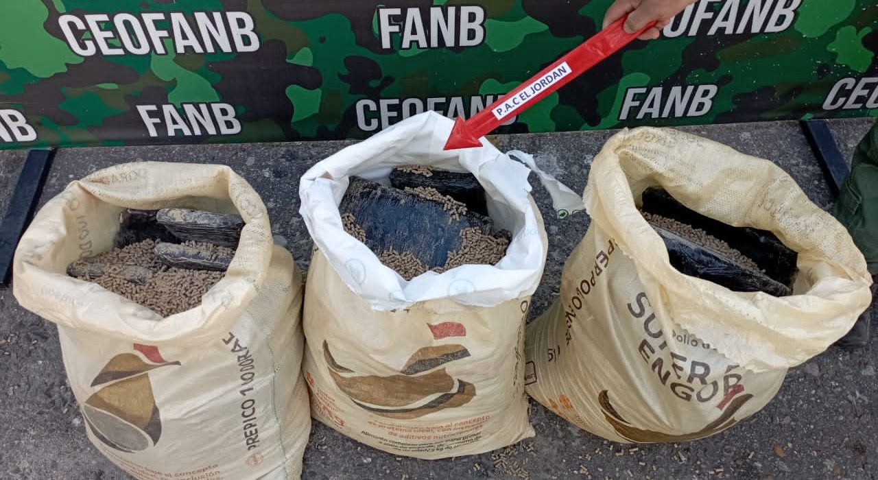 Oculta en bultos de alimento para pollos, fueron detectadas 40 panelas de presunta marihuana.