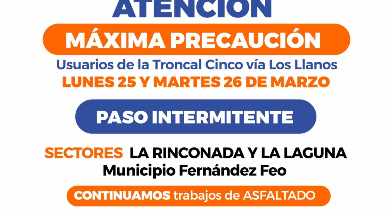 Entre lunes y martes del corriente mes se acometerán trabajos de asfaltado en la vialidad de la Troncal 005 vía Los Llanos, específicamente a la altura de los tramos La Rinconada y La Laguna. Precisó el titular del Instituto de Vialidad (IVT), Ángel Márquez.