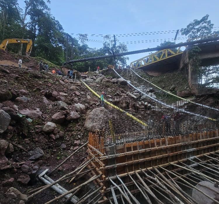 Avanzamos en la ejecución del muro de concreto armado sobre micro-pilotes de 20 metros de ancho por 6 metros de altura, para fortalecer las columnas del puente en la vía de la ramal 14, sector Macanillo, el cual ha sido afectado por el río Zúñiga.