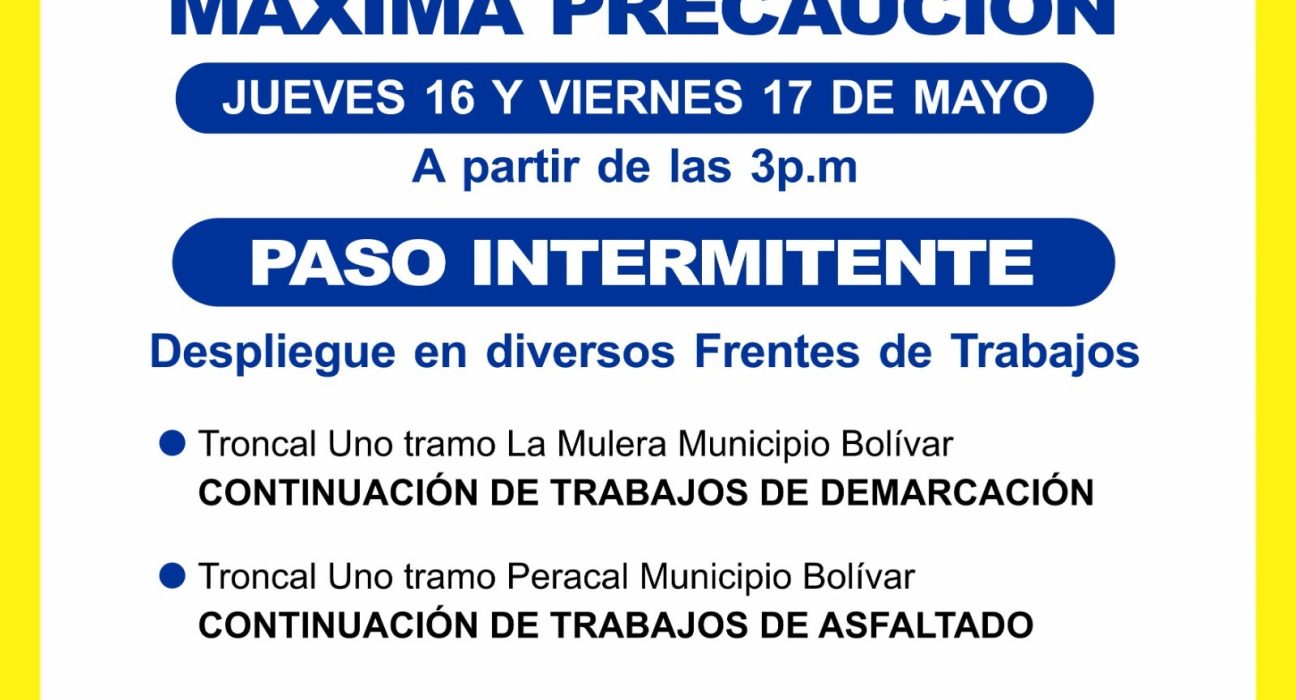 A partir de las 3 de la tarde de los días jueves 16 y viernes 17 de mayo del presente año, se realizarán trabajos simultáneos a la altura de los tramos La Mulera y Peracal; en la vialidad de la Troncal Uno que conduce al eje binacional. Durante estos días regirá medida de circulación vehicular de forma intermitente.