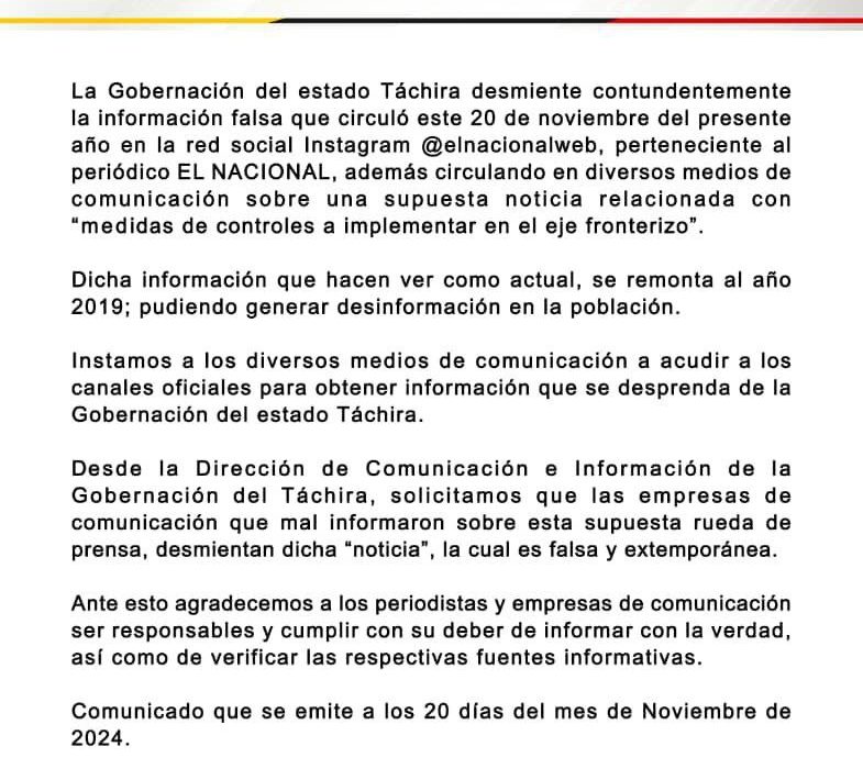 La Gobernación del estado Táchira desmiente contundentemente la información que circuló (ayer) 20 de noviembre del presente año, en la red social Instagram: @elnacionalweb, perteneciente al periódico El Nacional, que además se difundió en diversos medios de comunicación sobre una supuesta noticia relacionada con “medidas de controles a implementar en el eje fronterizo”.