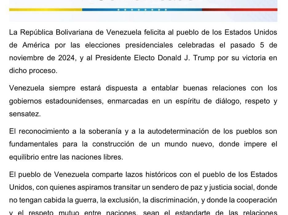 La República Bolivariana de Venezuela felicita al pueblo de los Estados Unidos de América por las elecciones presidenciales celebradas el pasado 5 de noviembre de 2024; y al presidente Electo Donald J. Trump, por su victoria en dicho proceso.