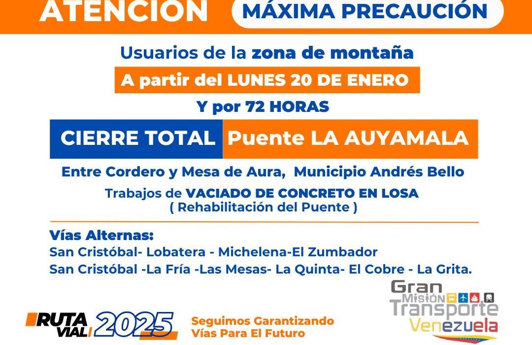 El lunes 20 de enero del corriente año, a partir de las 7 de la mañana será cerrado durante 72 horas continúas el paso vehicular sobre el Puente La Auyamala, en la vialidad de la Troncal 07 (TO07), sector La Ficala en el municipio Andrés Bello. El anuncio lo hizo el titular del Instituto de Vialidad (IVT), Ángel Márquez.