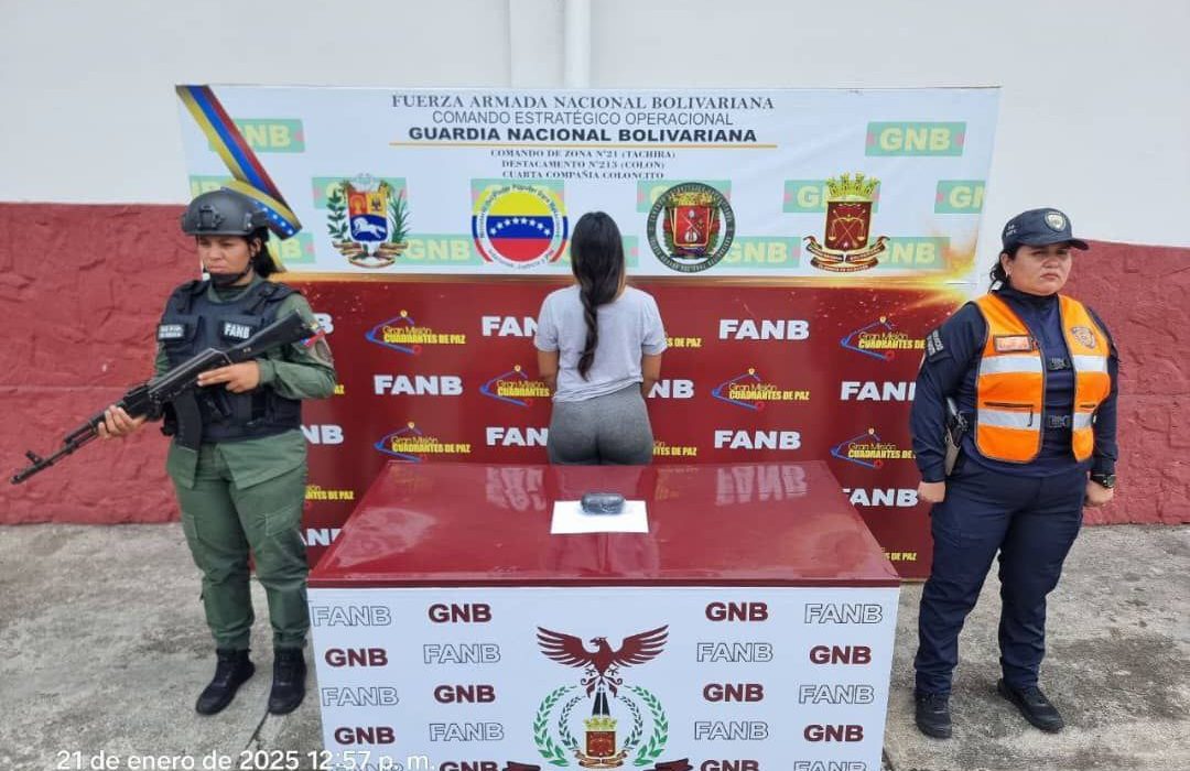 Una mujer fue detenida por efectivos de la Fuerza Armada Nacional Bolivariana, en Coloncito, municipio Panamericano, cuando trataba de transportar droga en sus partes íntimas.