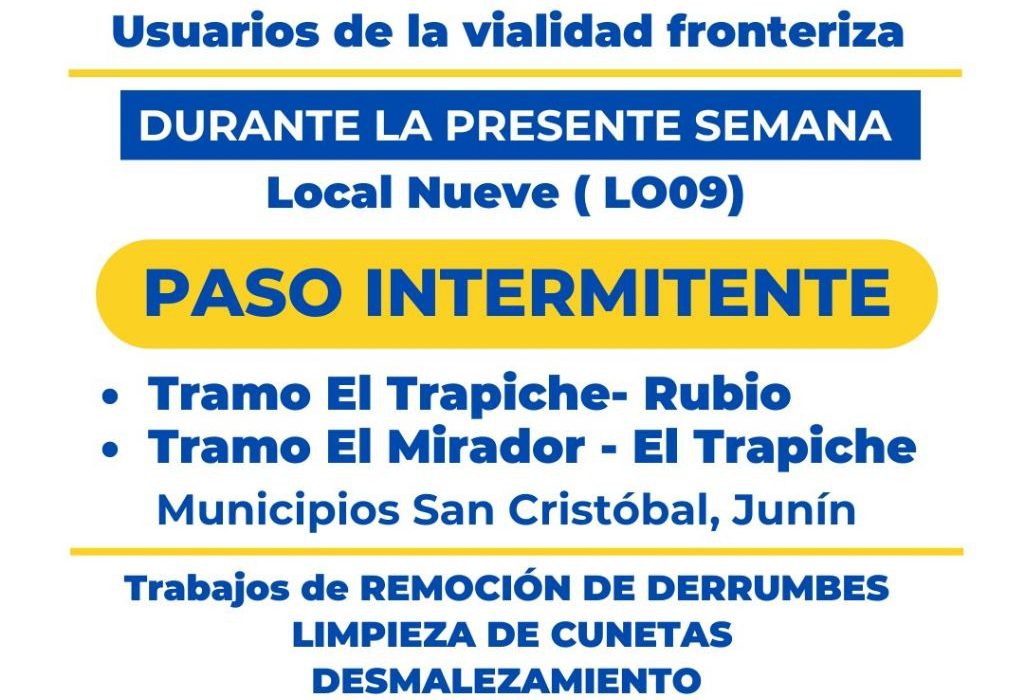 Ante ello, se recomienda a los conductores tomar las precauciones del caso, ya que el paso será intermitente durante la ejecución de los trabajos en sentido El Trapiche- Rubio y en dirección El Trapiche- -El Mirador, en donde estarán desplegadas las cuadrillas y las maquinarias.