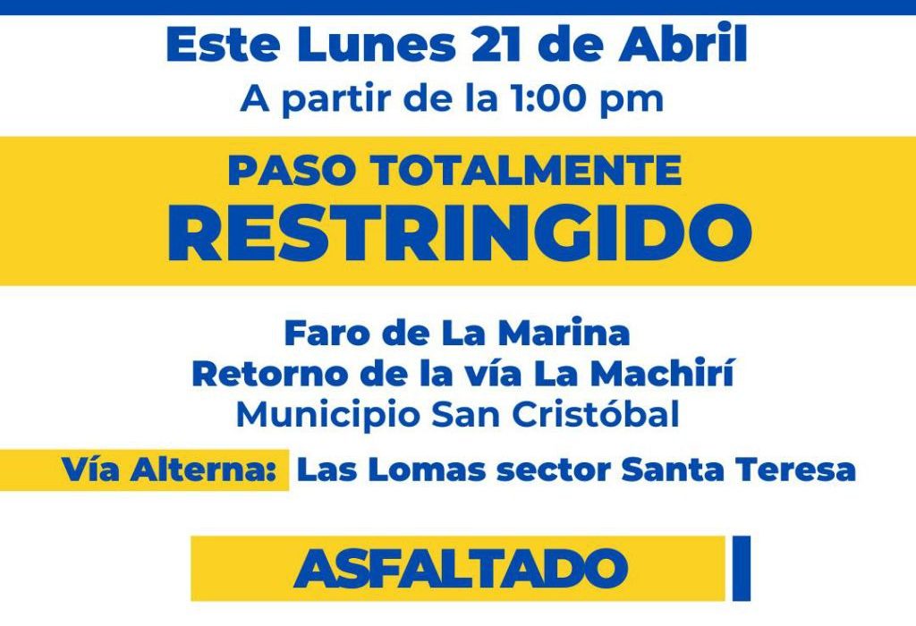 Ángel Márquez, presidente del ente de infraestructura, informó que a partir de hoy en horas de la tarde, regirá la medida de restricción total del paso vehicular. Motivo por el cual llamó a los usuarios a tomar las previsiones necesarias y a utilizar como ruta alterna la vía Las Lomas-Santa Teresa.