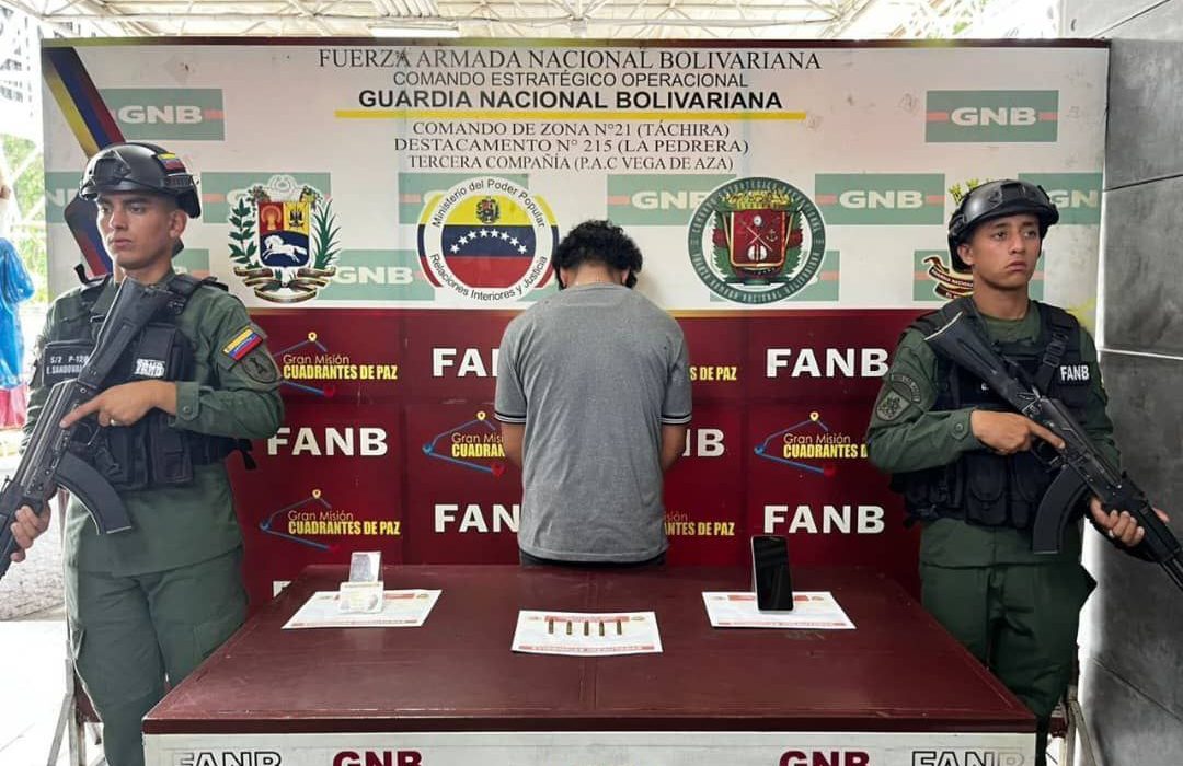 La detención se logró en el Punto de Atención al Ciudadano Vega de Aza, -ZODI 21 Táchira-; cuando el ciudadano se trasladaba en un vehículo de transporte público desde San Cristóbal, con destino a la ciudad de Caracas.