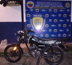 El comisario general Jeffrey Rodríguez, director de la Policía Nacional Bolivariana (PNB) en Táchira, informó la detención de dos sujetos implicados en el delito de robo de vehículo, automotor agravado (moto), en el sector «La Quebradita», municipio Córdoba.
