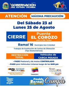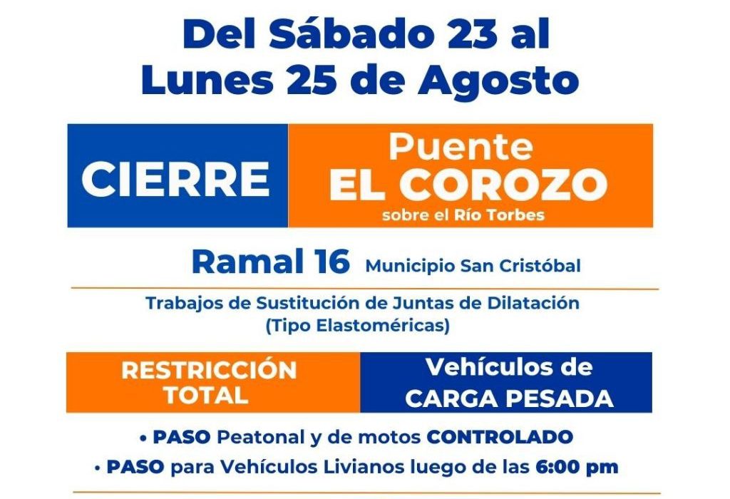 Motivado a la ejecución de trabajos de sustitución de las juntas de dilatación en el Puente El Corozo sobre el Río Torbes, ubicado en el Ramal 16; será restringido el tránsito vehicular desde el sábado 23 hasta el lunes 25 de agosto.
