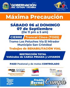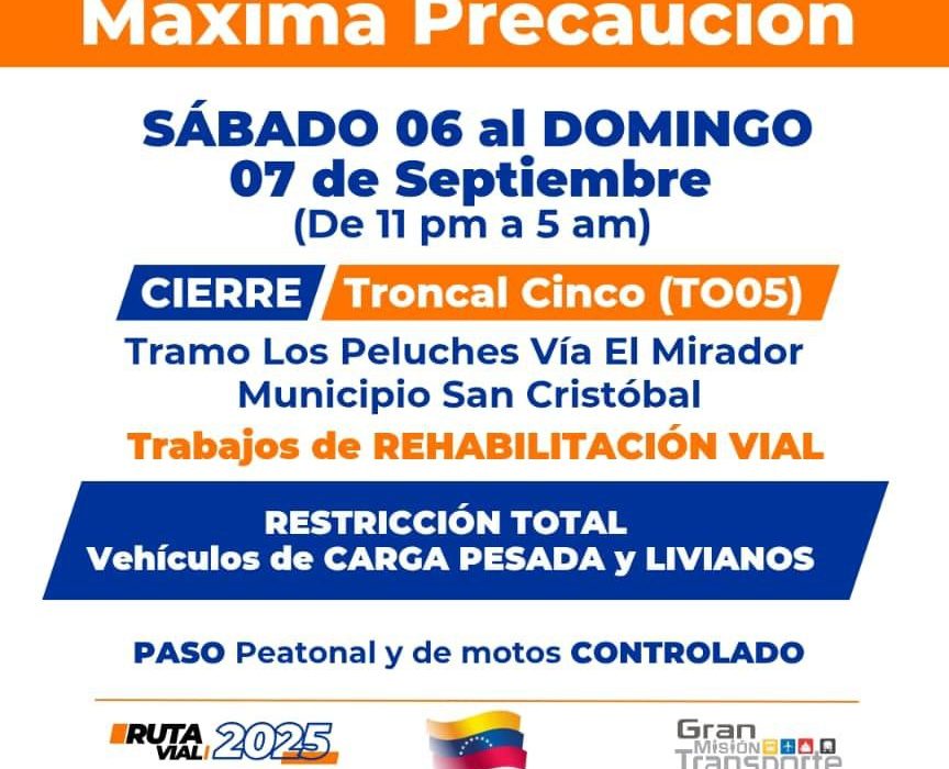 A partir de las once de la noche del sábado 06 hasta las cinco de la madrugada del domingo 07 de septiembre, no habrá paso vehicular en la vialidad de la Troncal Cinco (TO05), a la altura del sector Los Peluches, vía El Mirador, municipio San Cristóbal.