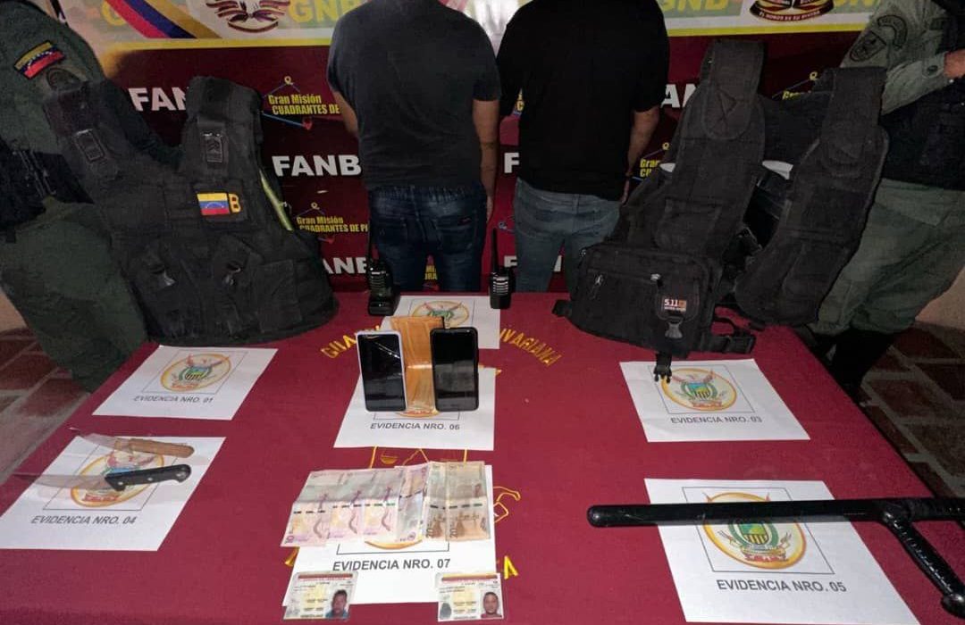 Los ciudadanos fueron detenido en flagrancia e identificados con el GEDO Los Pepones. Se les incautó dos (02) chalecos antibalas, dos (02) radio transmisores, un (01) cargador, dos (02) armas blancas y una (01) tonfa policial.