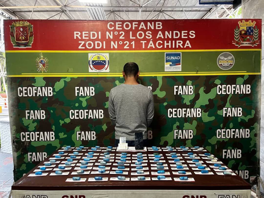 Los efectivos de la Fuerza Armada Nacional Bolivariana indican en el parte militar que el sujeto llevaba en su estómago, ochenta y dos (82) dediles contentivos de cocaína. Arrojando un peso bruto de un kilo con ochenta y cinco gramos (1,085 kg).