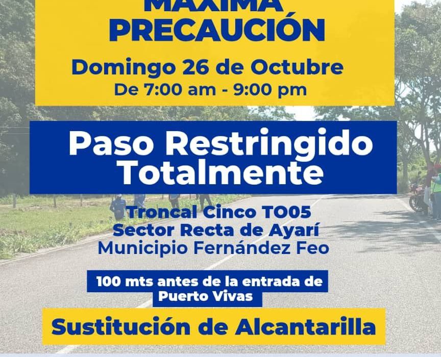 La tubería metálica que será reemplazada está ubicada exactamente 100 metros antes de la entrada a la localidad de Puerto Vivas, en el municipio Fernández Feo, contemplándose su intervención en todo el ancho de la calzada, lo que restringe totalmente el desplazamiento vehicular en la zona.
