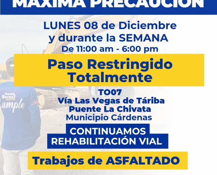 Motivado a la ejecución de trabajos de asfaltado está restringido el paso vehicular por la Troncal Siete (TO07) a la altura de la vía Las Vegas de Táriba -Puente La Chivata, municipio Cárdenas, desde las 11 de la mañana hasta las 6 de la tarde.