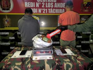 El procedimiento se llevó a cabo en el marco de los operativos de seguridad desplegados en el Eje Metropolitano de la capital andina, jurisdicción de la ZODI 21 Táchira, dónde efectivos militares practicaron la aprehensión de dos ciudadanos vinculados al tráfico ilícito de sustancias estupefacientes y psicotrópicas. Lograron incauta siete envoltorios de cocaína con un peso bruto de seis kilos con cuatrocientos veinticinco gramos (6,425 kg).