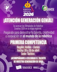 Delegaciones de 6 estados se darán cita en el Pabellón Venezuela de Pueblo Nuevo durante el miércoles 29 y jueves 30 de abril, cuando se celebre la fase regional de la Olimpiada de Robótica Creativa Andes – Llanos. Un evento donde se demostrará el talento, el ingenio y la destreza de más de 250 jóvenes de los estados Amazonas, Apure, Barinas, Mérida, Trujillo y por supuesto Táchira, quienes durante dos días expondrán sus proyectos ante un exigente equipo de evaluadores y determinarán cuál será el selecto grupo que clasifique a las Olimpiadas Nacionales a efectuarse en la ciudad de Caracas a finales del mes de mayo.