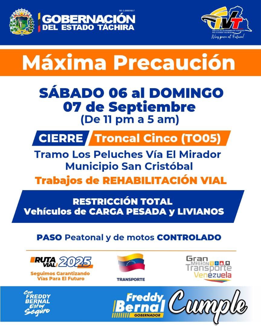 Cierre de la Troncal 05 sector Los Peluches Jornada nocturna de 11 p.m. a 5 a.m. de sábado a domingo Cierre de la Troncal 05 sector Los... 5 de septiembre de 2025